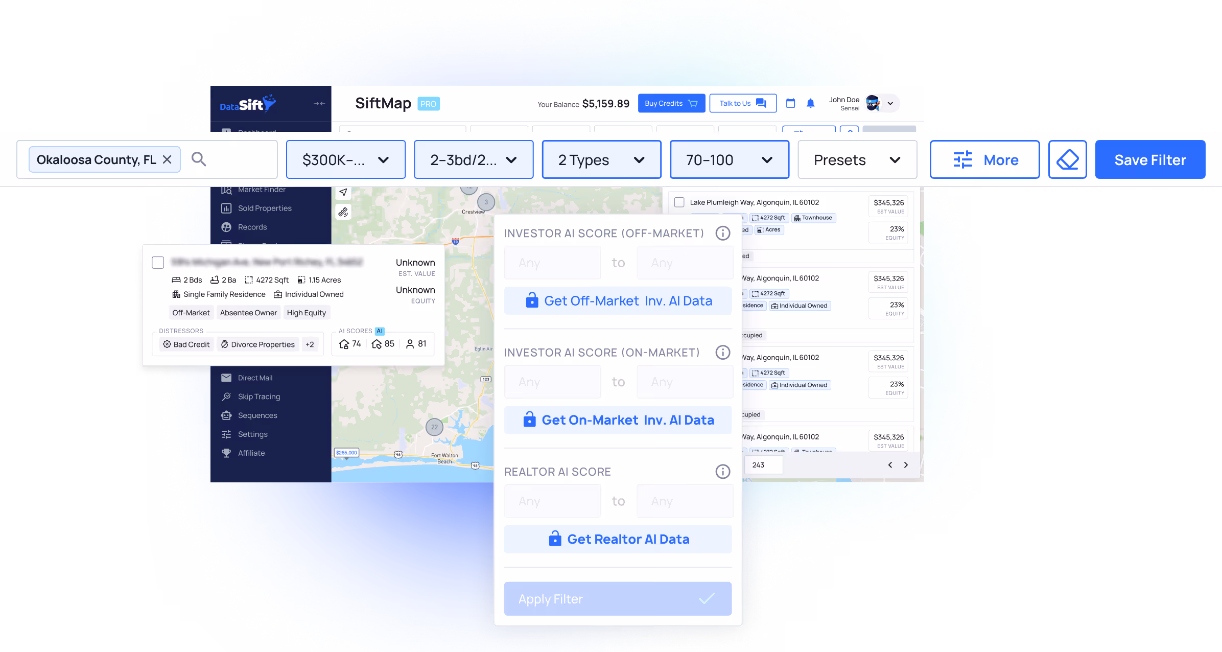 DataSift AI delivers predictive prospecting scores that rank properties from 0–100 based on their likelihood to: